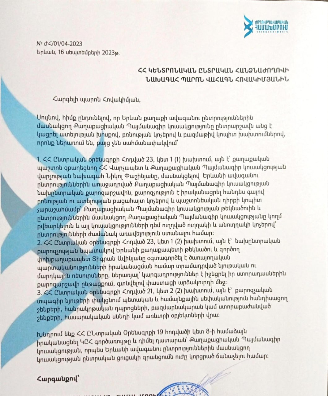 Նիկոլ Փաշինյանը բռնության կոչ է հնչեցրել. «Ժողովրդավարական Համախմբում»-ը դիմում է ներկայացրել ԿԸՀ