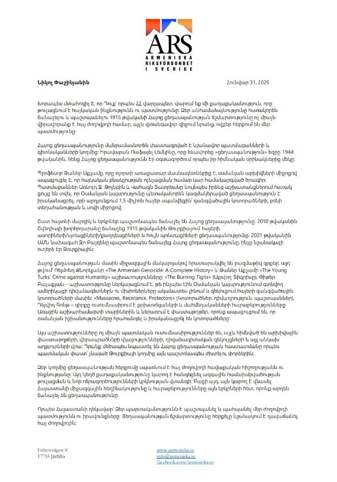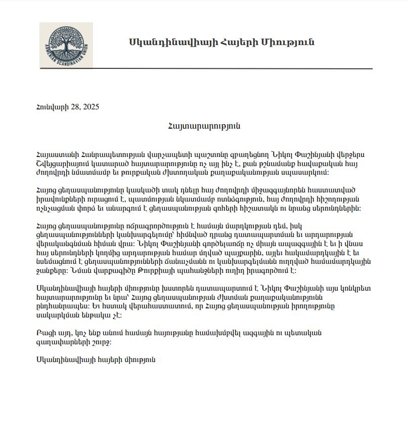 Այժմ հրապարակում ենք «Սկանդինավիայի հայերի միության» և «Շվեդիայի հայերի միության» հայտարարությունները