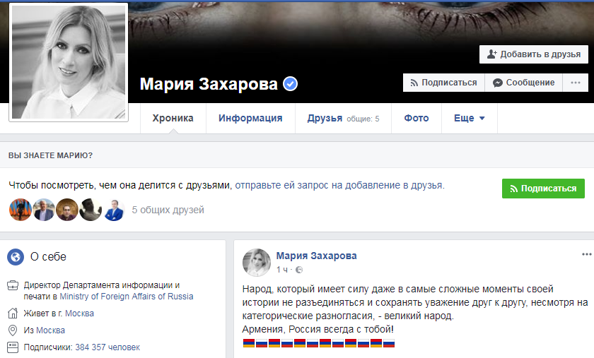 ՌԴ ԱԳՆ պաշտոնական ներկայացուցիչ Մարիա Զախարովան իր ֆեյսբուքյան էջում անդրադարձել է Երևանում կատարվող իրադարձություններին: