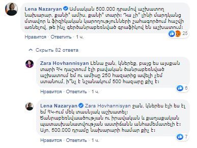 Գրառման մեկնաբանություններում ԱԺ փոխնախագահ Լենա Նազարյանը գրել է. «Ամսական 500.000 դրամով աշխատող նախարար, քանի՞ ամիս, քանի՞ տարի։ Դա չի՞ լինի մարդկանց մտավոր և ֆիզիկական կարողությունների շահագործում հաշվի առնելով, թե ինչ գերծանրաբեռնված գրաֆիկով են աշխատում»։