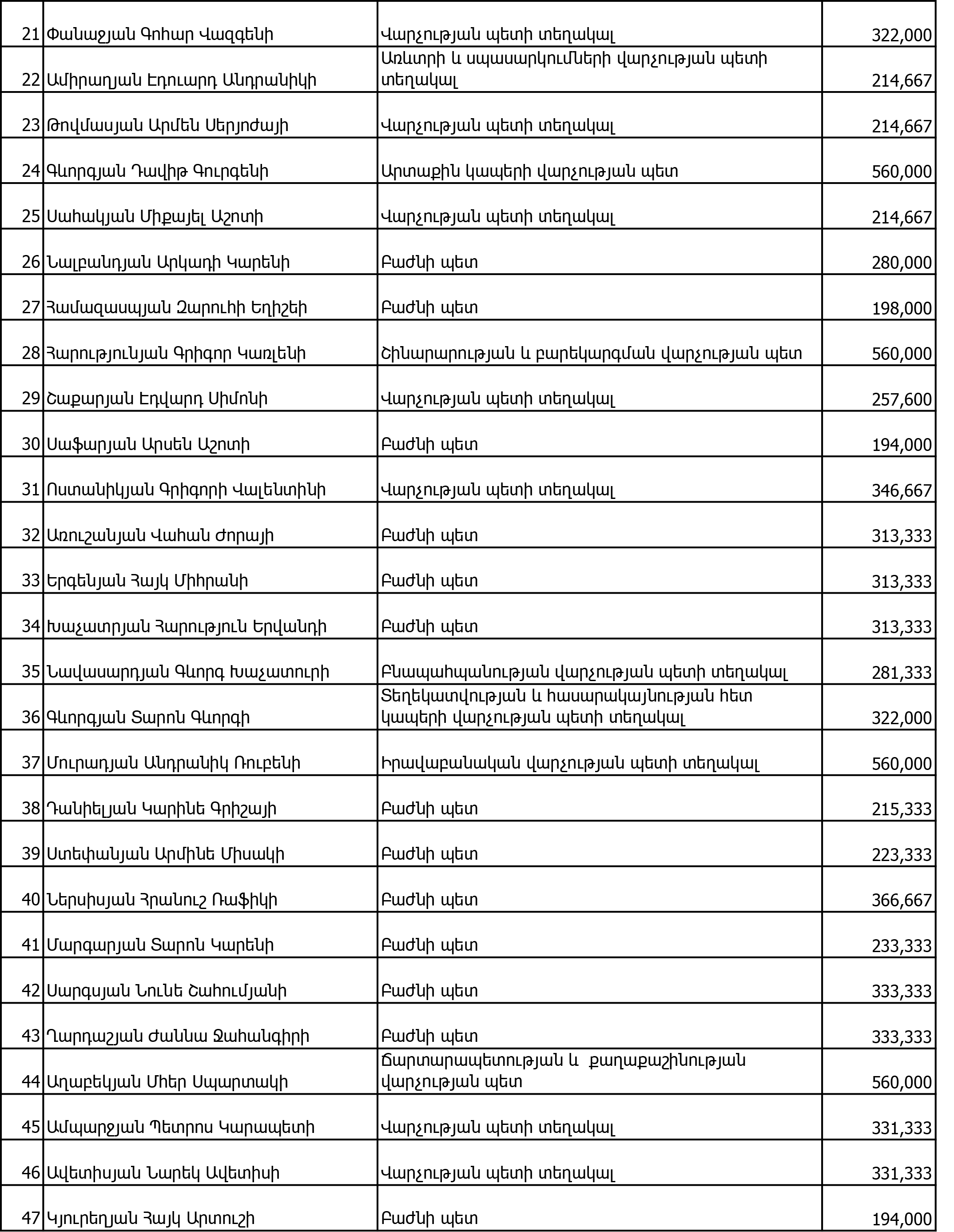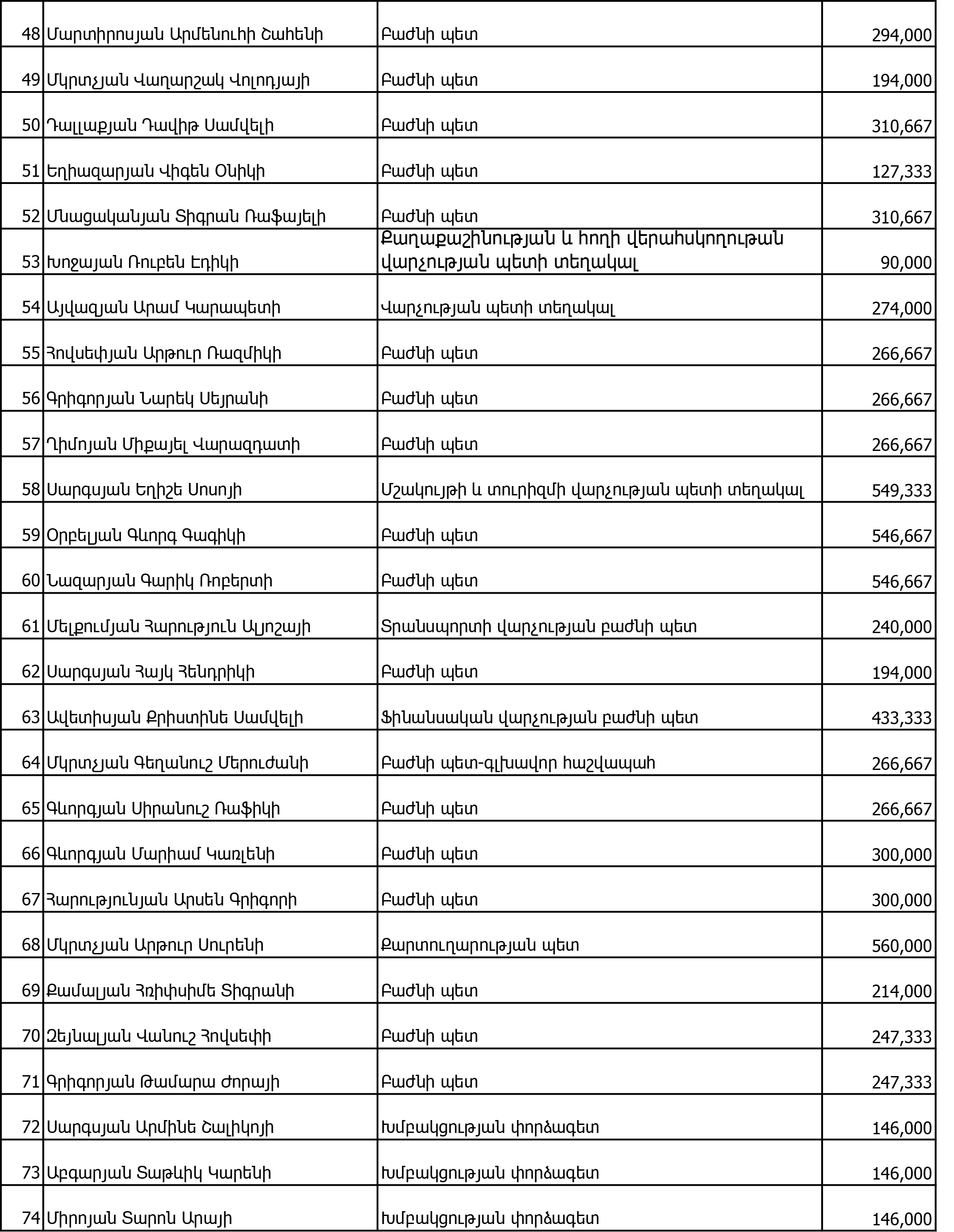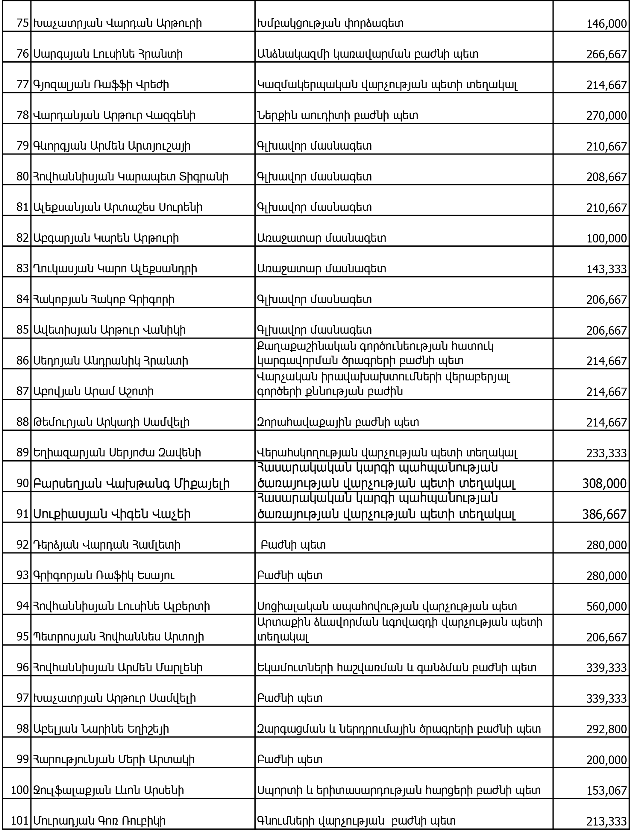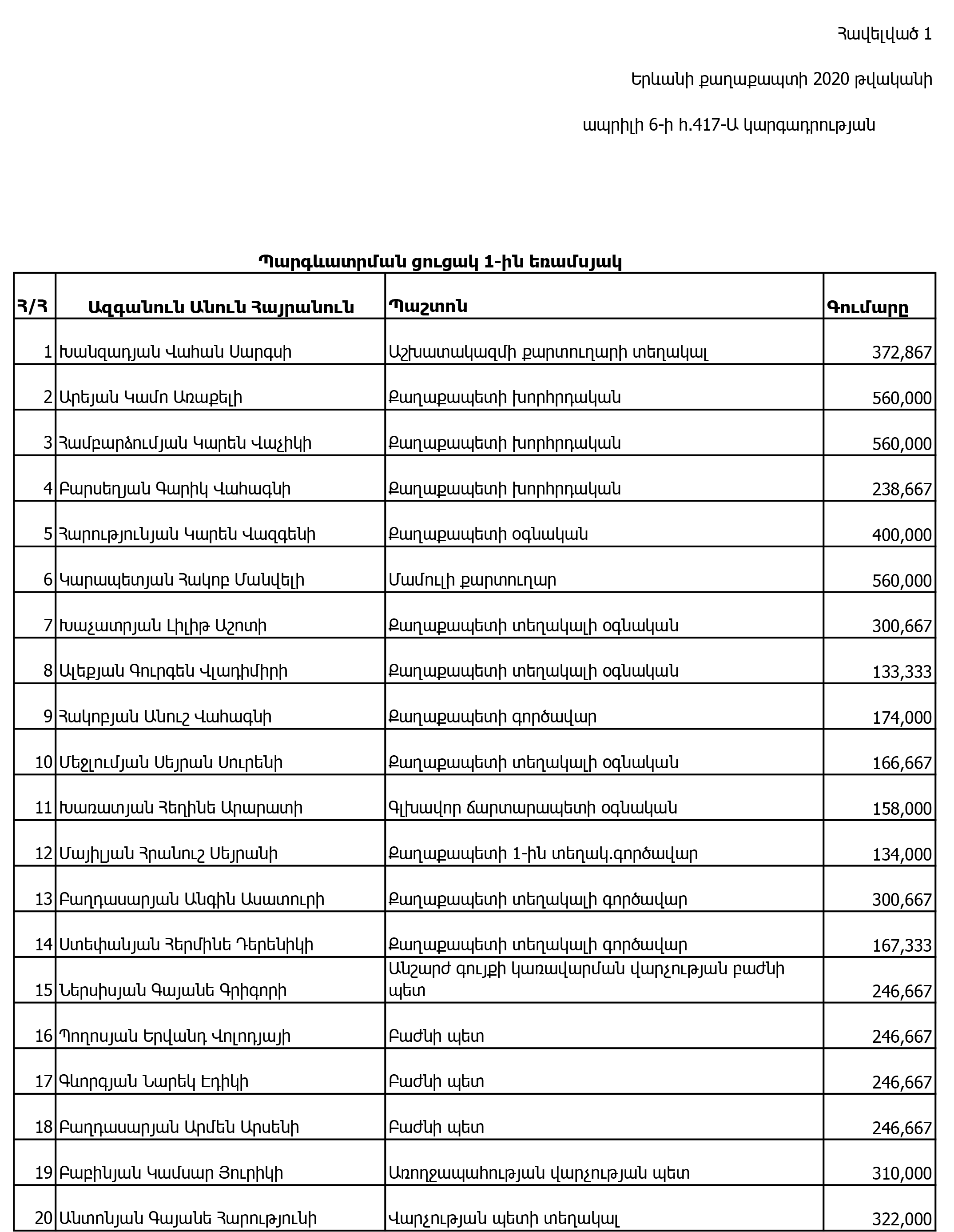 Սոցիալական ապահովության վարչության պետը, քաղաքապետի երեք խորհրդականներից երկուսը՝ Կամո Արեյանն ու Կարեն Համբարձումյանը, մամուլի քարտուղար Հակոբ Կարապետյանը, Արտաքին կապերի վարչության պետ Գևորգ Դավթյանը, Շինարարության և բարեկարգման վարչության պետ Գրիգոր Հարությունյանը, Իրավաբանական վարչության պետի տեղակալ Անդրանիկ Մուարդյանը, Ճարտարապետության և քաղաքաշինության վարչության պետ Մհեր Աղաբեկյանը, Քարտուղարության պետ Արթուր Մկրտչյանը պարգևատրվել են ամենաբարձրը՝ 560 հազար դրամ:
