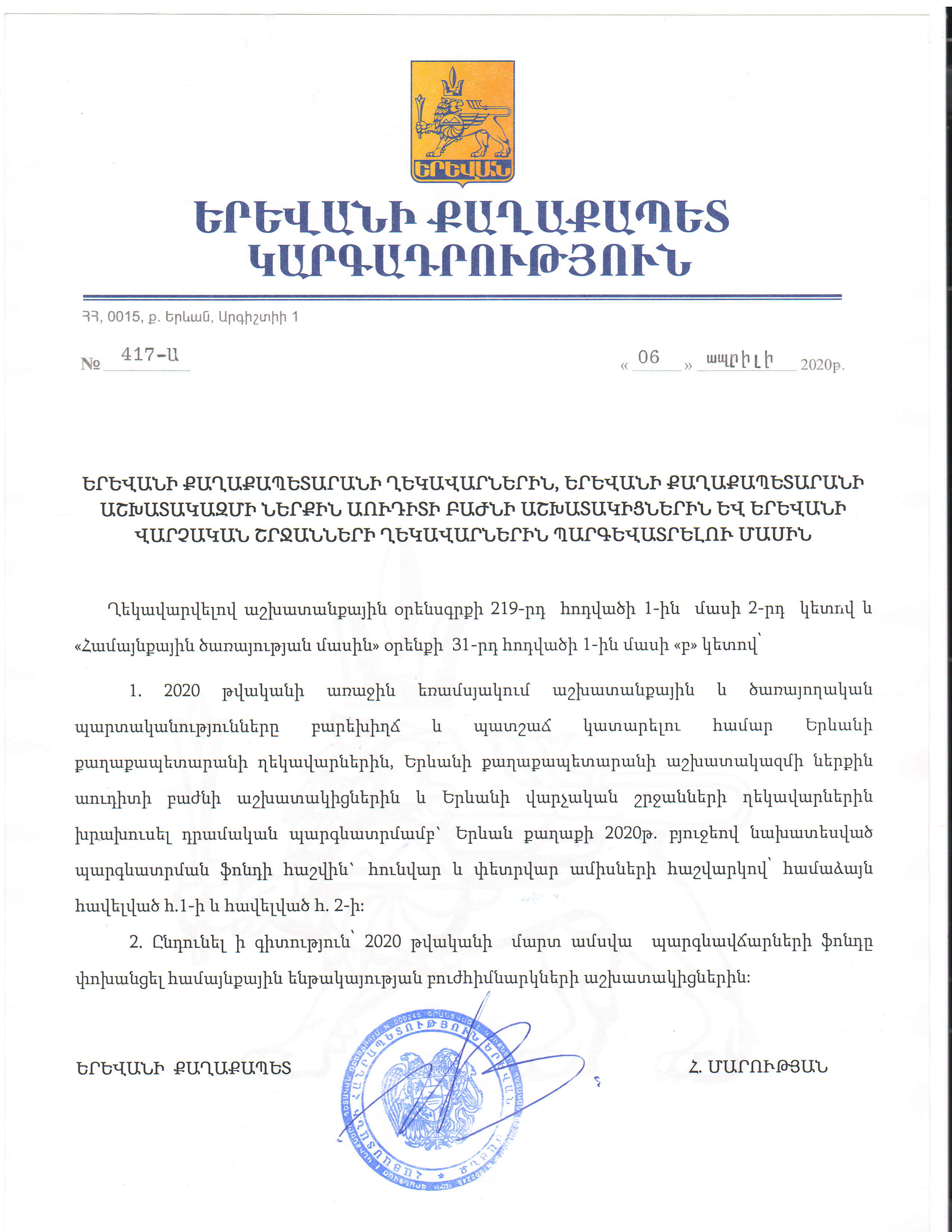 Մեկ այլ առանձին հրամանով պարգևատրվել է քաղաքապետի տեղակալ Տիգրան Վիրաբյանը՝ 203 հազար դրամով: