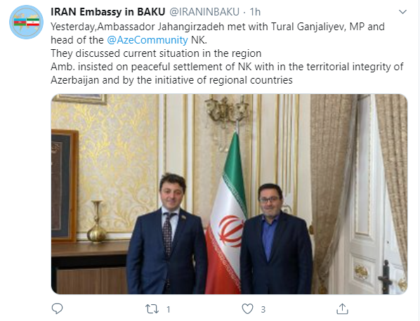 Հիշեցնենք, որ Ադրբեջանում Իրանի դեսպանության թվիթերյան օգտահաշվում հրապարակվել է, ինչպես այնտեղ է նշված՝ «ԼՂ ադրբեջանական համայնքի» ղեկավար Թուրալ Գանջալիևի և Ադրբեջանում Իրանի դեսպան Ջահանգիրզադեի լուսանկարը, որին կից՝ գրառում. «Նրանք քննարկել են տարածաշրջանում առկա իրավիճակը։ Դեսպանը պնդել է, որ Լեռնային Ղարաբաղի խաղաղ կարգավորումը կլինի Ադրբեջանի տարածքային ամբողջականության շրջանակներում և տարածաշրջանային երկրների նախաձեռնությամբ»։