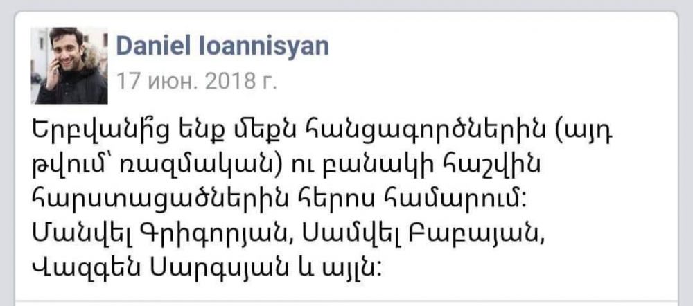 Սոցիալական ցանցերում հիմա շատերը ծափահարում են սորոսական Դանիել Իոաննիսյանին, ավելին, նրան Արցախում դիմավորում են սպաները, որոնք նաև «գիդի» դեր են տանում նրա համար։ Եվ սա այն դեպքում, երբ իշխանափոխությունից հետո Իոաննիսյանը հայտարարել էր, որ Սպարապետ Վազգեն Սարգսյանը հանցագործ է։