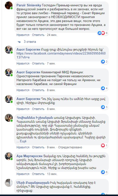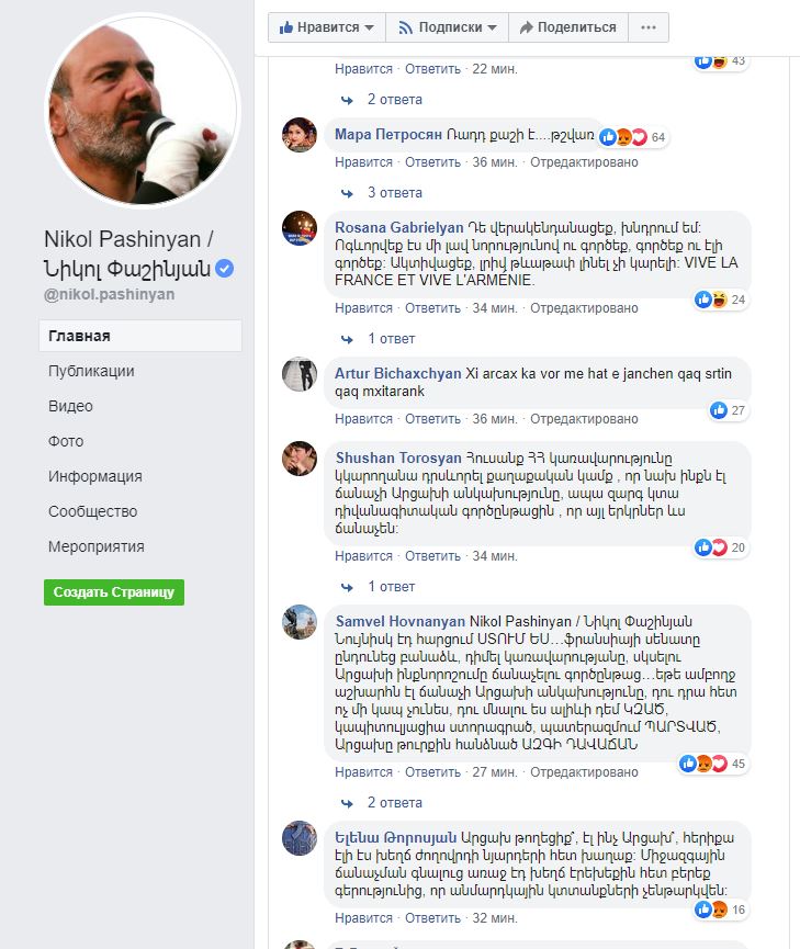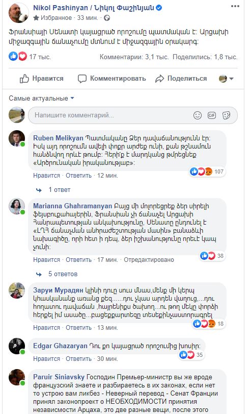 «Ֆրանսիայի Սենատի կայացրած որոշումը պատմական է։ Արցախի միջազգային ճանաչումը մտնում է միջազգային օրակարգ»,-ֆեյսբուքյան իր էջում գրել է Նիկոլ Փաշինյանը։