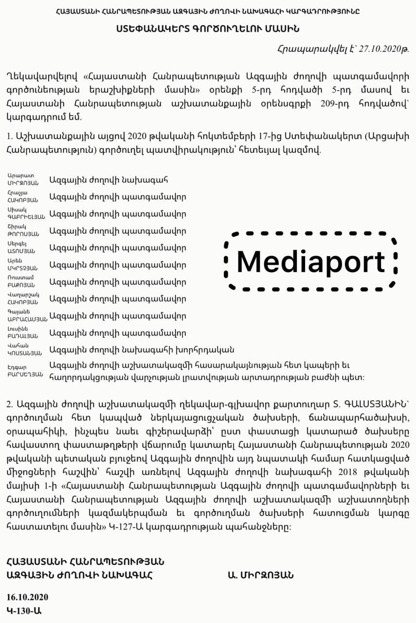 Mediaport-ի տրամադրության տակ հայտնված փաստաթղթի համաձայն, Արարատ Միրզոյանը համապատասխան հրամանը ստորագրել է 2020թ.-ի հոկտեմբերի 16-ին`պատերազմի ամենաթեժ օրերին, երբ հազարավոր հայեր՝ Սփյուռքում ու Հայաստանում, գումար էին հանգանակում «Հայաստան համահայկական հիմնադրամին» և կամավորագրվում էին, մինչդեռ Արարատ Միրզոյանը, Նիկոլ Փաշինյանի աներձագն ու մյուսներն անգամ Արցախ մեկնելու ճանապարհածախսն էին փաստորեն բյուջեից վերցնում: