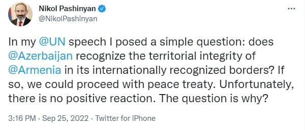 ՄԱԿ-ում՝ իմ ելույթում, ես պարզ հարց տվեցի՝ արդյո՞ք Ադրբեջանը ճանաչում է Հայաստանի տարածքային ամբողջականությունը միջազգայնորեն ճանաչված սահմաններով: Այս մասին թվիթերյան իր միկրոբլոգում գրել է ՀՀ վարչապետ Նիկոլ Փաշինյանը: