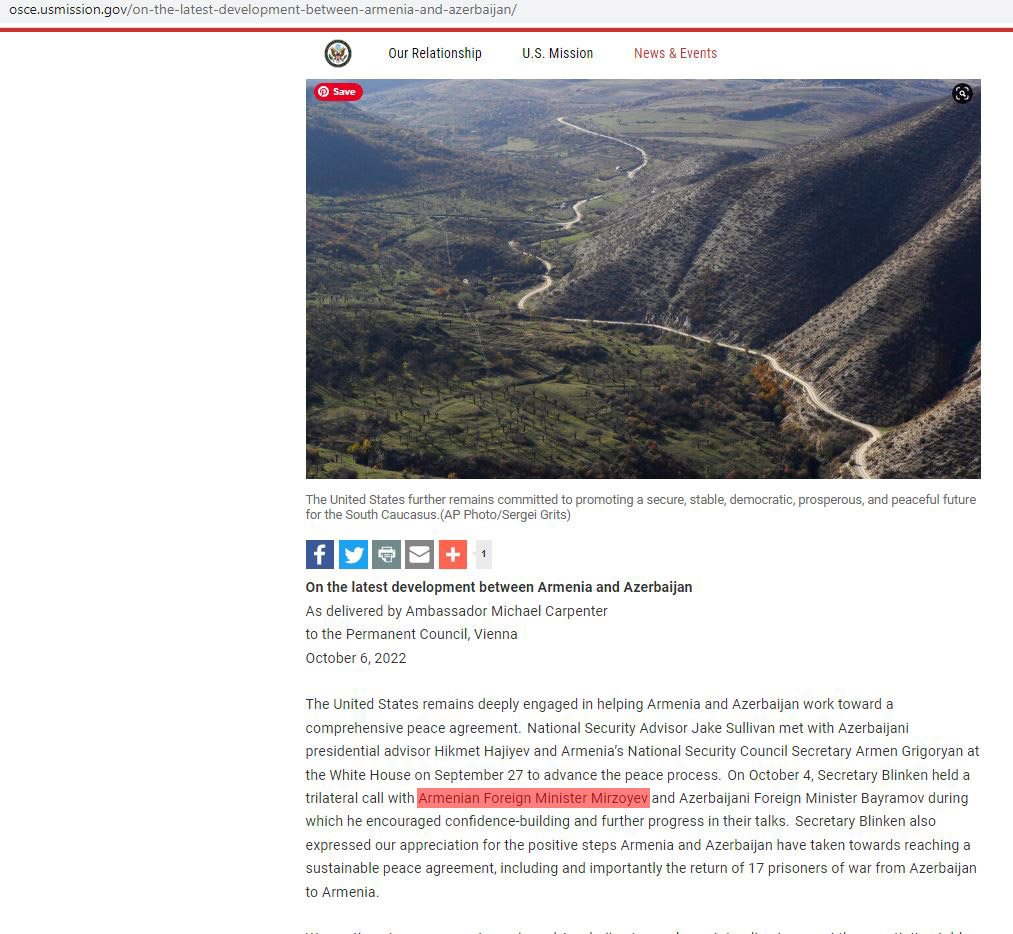 ԵԱՀԿ-ում ԱՄՆ առաքելությունը հանդես է եկել Հայաստանի և Ադրբեջանի միջև վերջին զարգացումների մասին տեղեկատվությամբ։ ԵԱՀԿ պաշտոնական կայքում տեղեկացնում են․ «Ազգային անվտանգության հարցերով խորհրդական Ջեյք Սալիվանը սեպտեմբերի 27-ին Սպիտակ տանը հանդիպել է Ադրբեջանի նախագահի խորհրդական Հիքմեթ Հաջիևի և Հայաստանի Ազգային անվտանգության խորհրդի քարտուղար Արմեն Գրիգորյանի հետ՝ խաղաղ գործընթացն առաջ մղելու նպատակով։ Հոկտեմբերի 4-ին պետքարտուղար Բլինկենը եռակողմ զրույց է ունեցել Հայաստանի արտգործնախարար Միրզոևի և Ադրբեջանի արտգործնախարար Բայրամովի հետ, որի ընթացքում նա խրախուսել է վստահության ձևավորումը և հետագա առաջընթացը նրանց բանակցություններում։ Պետքարտուղար Բլինկենը նաև մեր երախտագիտությունն է հայտնել Հայաստանի և Ադրբեջանի կողմից կայուն խաղաղության համաձայնագրի հասնելու ուղղությամբ ձեռնարկված դրական քայլերի համար, ներառյալ և կարևոր է Ադրբեջանից Հայաստան 17 ռազմագերիների վերադարձը»։