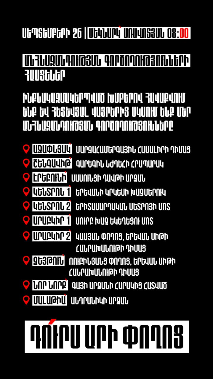 Անդրանիկ Թևանյանը Հանրապետության հրապարակում հանրահավաքի ժամանակ հրապարակեց սեպտեմբերի 26-ին տեղ ունենալիք ակցիաների ցանկը։