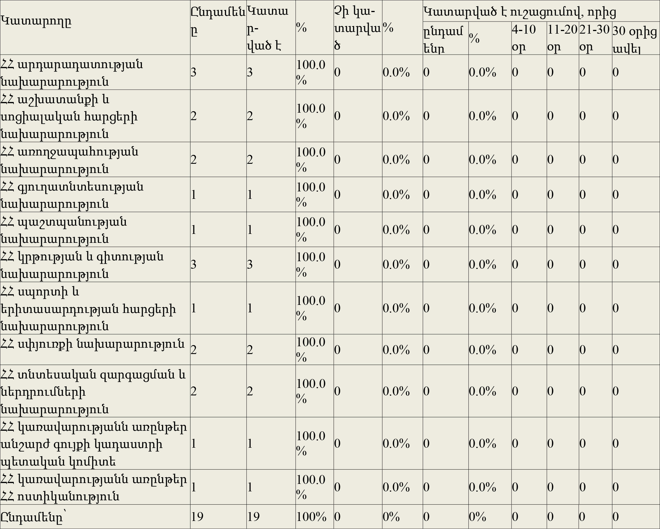 ՀՀ կառավարության 2018թ. գործունեության միջոցառումների ծրագրով հունվարից մինչև մարտի 31-ը նխատեսված բոլոր հանձնրարականները կտարվել են: Հանձնարարականների կատարման նախագիծն ի գիտություն ընդունելու հարցը ներառաված էր կառավարության նիստի չզեկուցվող նախագծերի ցանկում: