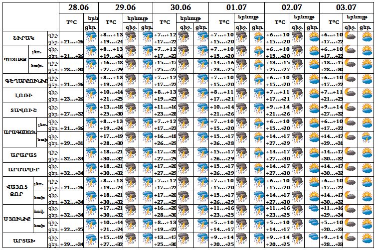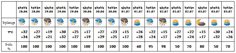 Երևան քաղաքում՝Հունիսի 28-ի ցերեկը, 29-30-ը, հուլիսի 1-ին, 2-ի գիշերը սպասվում է անձրև և ամպրոպ, ամպրոպի ժամանակ` նաև քամու ուժգնացում` մինչև 15-20 մ/վ արագությամբ: Հուլիսի 2-ի ցերեկը, 3-ին սպասվում է առանց տեղումների եղանակ: