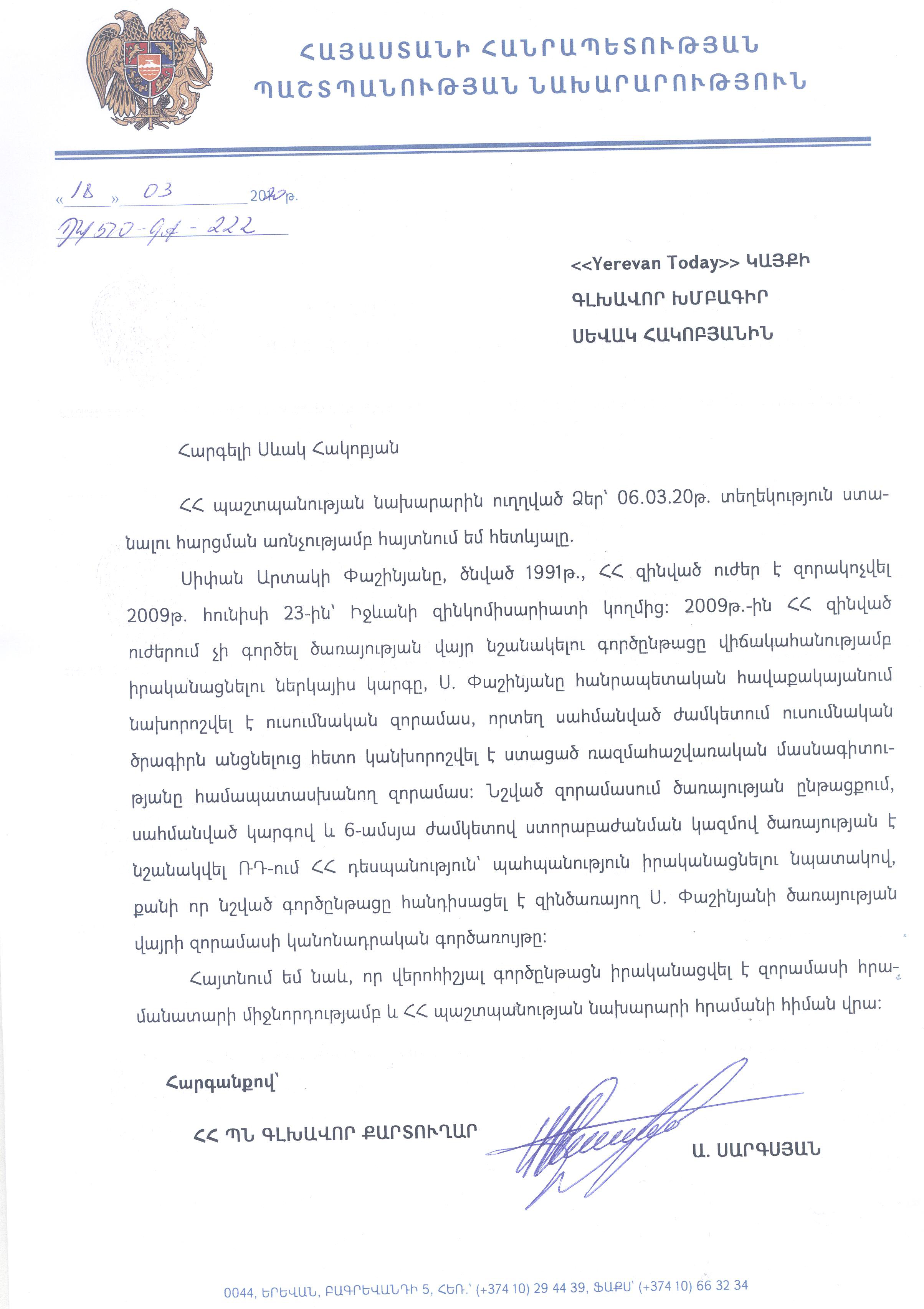ՀՀ Զինված ուժերի Գլխավոր շտաբից Yerevan.Today-ը ստացել է հարցման պատասխանը, թե ինչպես է ստացվել, որ Նիկոլ Փաշինյանի կողմից այդքան դատափետված բանակում, որտեղ իր բնութագրմամբ կոռուպցիոն գեներալիտետն է հաստատվել բարձր պաշտոններում, իր եղբորորդին հաջողել է խիստ էլիտար պայմաններում անցնել պարտադիր զինվորական ծառայությունը, ընդհուպ՝ հասել է Մոսկվա: Ըստ որում, ամենակարևոր հանգամանքը այստեղ ժամկետներն են․ սա տեղի է ունեցել ճիշտ այն ժամանակ, երբ Նիկոլ Փաշինյանը «սուր» ընդիմադիր գործիչ էր, իսկ եղբորորդի Սիփանը հասարակ գյուղացի մի տղա:
