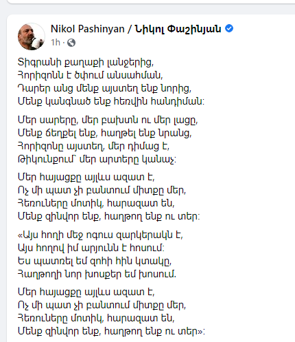 Վարչապետ Նիկոլ Փաշինյանը ֆեյսբուքյան իր էջում կիսվել է իր գրած բանաստեղծությամբ։ Այն տեղադրել է Ստեփանակերտի փողոցներով անցնող զինտեխնիկայի տեսանյութի հետ միասին։ Ի դեպ, ՊՆ-ն կոչ է արել չհրապարակել հայկական զինուժի տեղաշարժի տեսանյութեր։