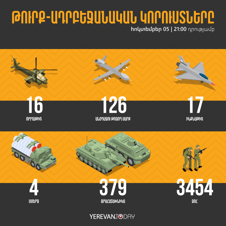 Հայկական զինված ուժերը մինչ այս պահը ոչնչացրել են թշնամու 16 ուղղաթիռ, 126 ԱԹՍ, 17 ինքնաթիռ, 4 «Սմերչ», 379 տանկ և զրահատեխնիկա, 3454 զոհ: