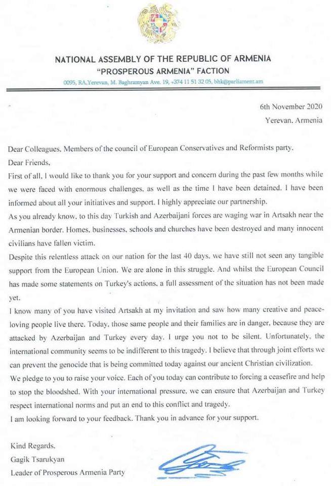 Այսօր նամակով դիմել եմ Եվրոպայի պահպանողականների և ռեֆորմիստների դաշինքի խորհրդի անդամներին, որտեղ ներկայացրել եմ Արցախում և Հայաստանի սահմաններին ծավալվող պատերազմական գործողությունները և հույս եմ հայտնել, որ Եվրոպական միության գործընկերները հստակ գնահատական կտան տիրող իրավիճակին: Այս մասին ֆեյսբուքյան իր էջում գրել է ԲՀԿ ղեկավար Գագիկ Ծառուկյանը։