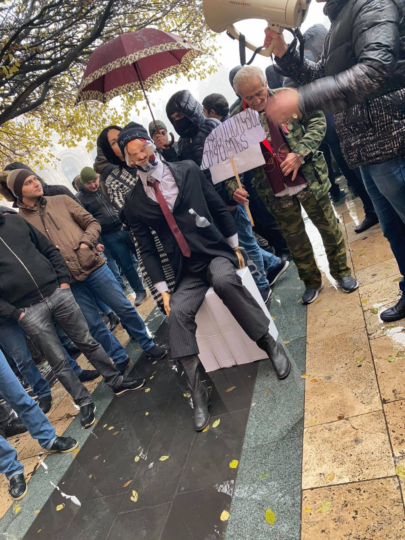 Դեկտեմբերի 16-ին կառավարության շենքի դիմաց բողոքի հերթական ակցիան է: Մի շարք քաղաքացիներ պահանջում են Նիկոլ Փաշինյանի հրաժարականը: Նրանք իրենց հետ բերել էին խրտվիլակ՝ Դուխով գլխարկով և օղու շիշը գրպանը, որն իրենց խոսքով մարմնավորում է հենց Փաշինյանին:
