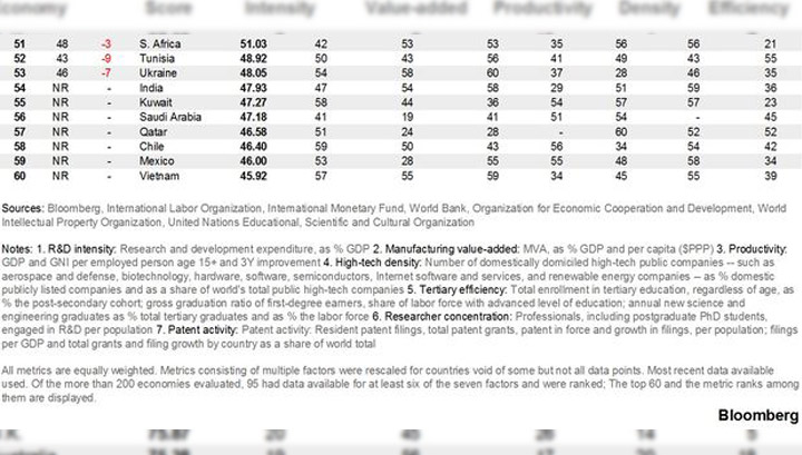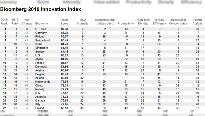 «Bloomberg-ի ինովացիոն ինդեքսը» յոթերորդ տարին է, ինչ ուսումնասիրում է տասնյակ չափորոշիչներ՝ հաշվի առնելով հետազոտությունների և զարգացման համար արվող ծախսերը, արդյունաբերական ներուժը և բարձր տեխնոլոգիական ընկերությունների համակենտրոնացումը: