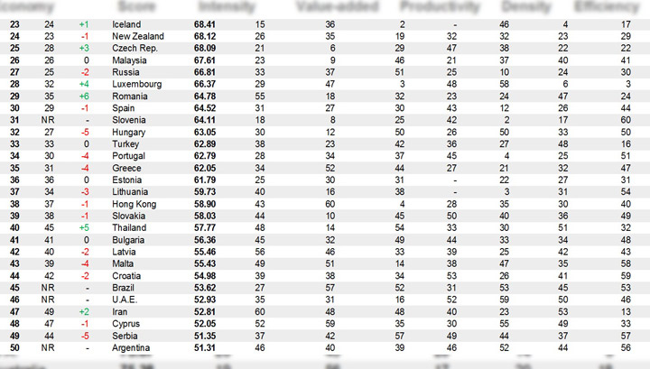 60 երկրից կազված ցուցակի առաջատար տասնյակում են նաև Ֆինլանդիան, Շվեյցարիան, Իսրայելը, Սինգապուրը, Շվեդիան, ԱՄՆ-ը, Ճապոնիան և Ֆրանսիան: