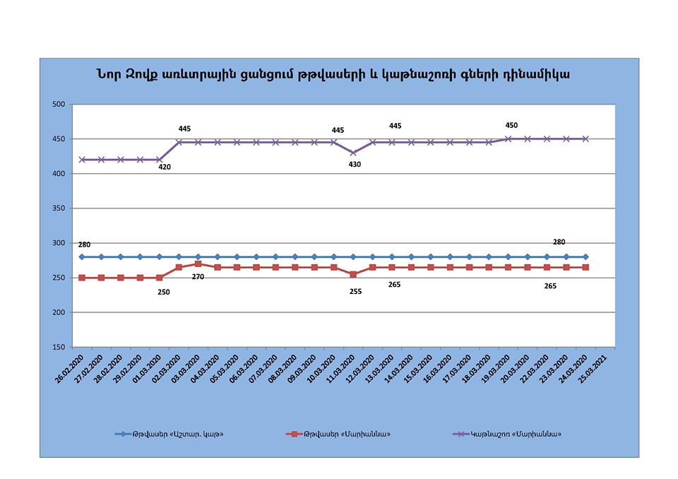 ՀՀ ՏՄՊՊՀ-ն հրապարակել է Նոր Զովք և Երևան սիթի առևտրային ցանցերում կարագի, երշիկի, պանրի, կանթաշոռի և թթվասերի գների դինամիկան՝ սկսած 2020 թվականի փետրվարի 26-ից: Այս մասին տեղեկացնում է Կառավարությունը: