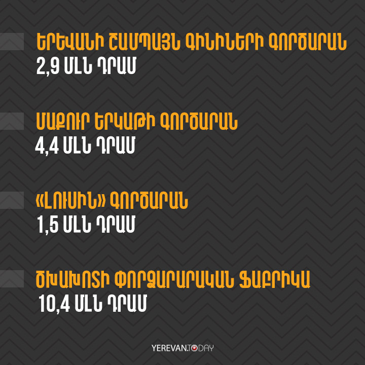 Բաժնետոմսերի քանակը բազմապատկելով դրանց արժեքին, հաշվարկենք, թե որքա՞ն են գնահատվել այս ձեռնարկությունները։ Ըստ այդմ, «Լուսին» գործարանի արժեքը կազմել է 62,5 մլն դրամ, Երևանի շամպայն գինիների գործարանի արժեքը՝ 117 մլն դրամ, Մաքուր երկաթի գործարանինը՝ 175 մլն դրամ, Ծխախոտի փորձարարական ֆաբրիկայինը՝ 419 մլն դրամ։ Հիշեցնենք, որ խոսքը գնում է մի քանի մասնաշենքեր, արտադրական հզորություններ ունեցող և մեծ տարածքներ զբաղեցնող գործարանների մասին, որոնց արժեքը, ըստ էության, բերվել է մայրաքաղաքի բնակարանների կամ առանձնատների գներին։ Մի՞թե սա մեծագույն կոռուպցիան չէ և մի՞թե այդ ժամանակվա իշխանությունը այս ամենի մասնակիցը չէ։ Սակայն, այս ձեռնարկությունները սեփականաշնորհվել են ոչ այս գներով։