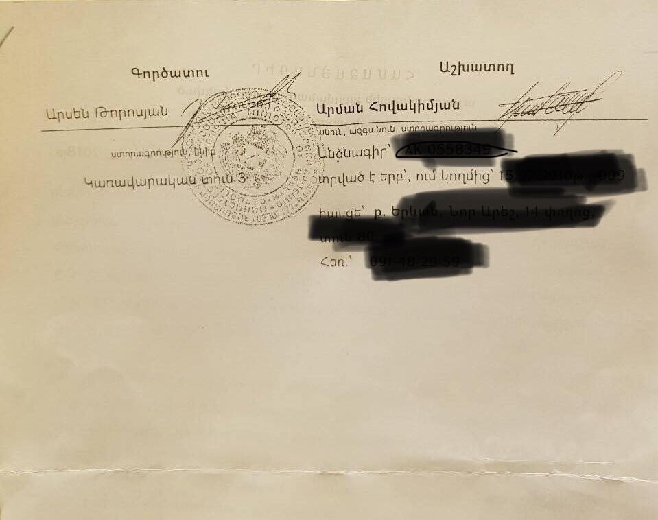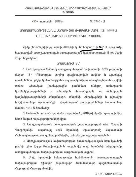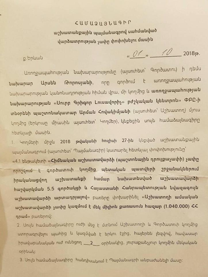 Նկատենք, որ աշխատավարձերի բարձրացման հրամանը նախարարը ստորագրել է ս.թ. հոկտեմբերի 30-ին: Եվ հիմա մեր ձեռքի տակ է հայտնվել նախարարի կողմից կնքված համաձայնագրի մի օրինակ իր մեկ այլ ընկերոջ մասով: Խոսքը վերաբերում է Ս. Գրիգոր Լուսավորիչ հիվանդանոցի տնօերն Արման Հովակիմյանին: Այդ համաձայանգիրը թվագրված է հոկտեմբերի 1-ով: